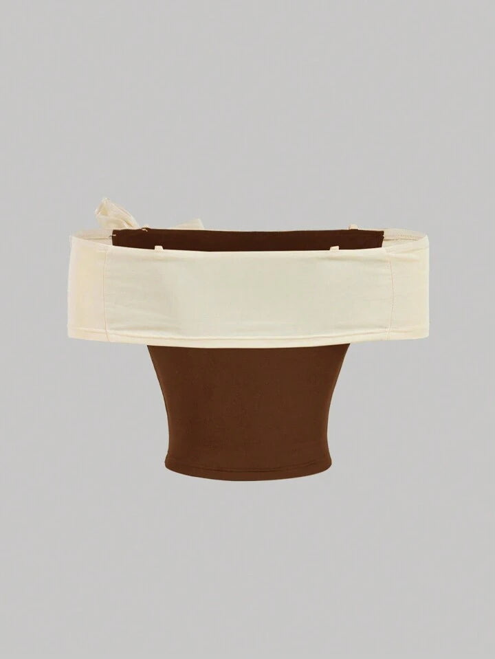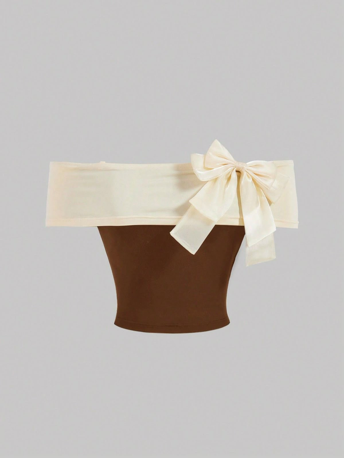 The Riana top features a stylish brown and off white color combination, perfect for adding a touch of elegance to any outfit. The off shoulder design is accented with charming bow detailing, adding a unique and sophisticated touch. Experience both fashion and comfort with the Riana top.